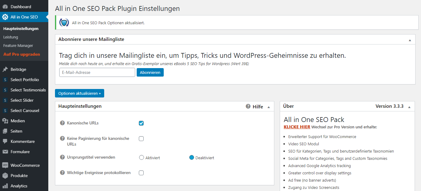 Installieren und aktivieren Sie das Plugin All in One SEO Pack – genauso wie jedes andere SEO Plugin auch – optimalerweise bevor die Inhalte eingestellt werden. Sie sparen sich auf jeden Fall Arbeit, wenn die Seiten und Beiträge direkt beim Einfügen der Texte auch für die Suchmaschinen optimiert werden.