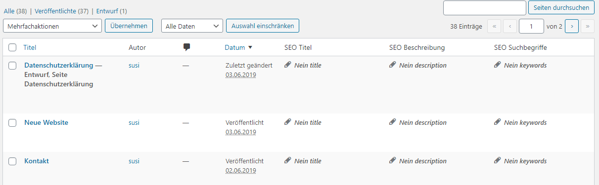 Nach Installation und Aktivierung des Plugins, sind in der Seiten- oder Beitragsübersicht bereits (die momentan noch nicht vergebenen) SEO Titel, SEO Beschreibung und SEO Suchbegriffe zu sehen.